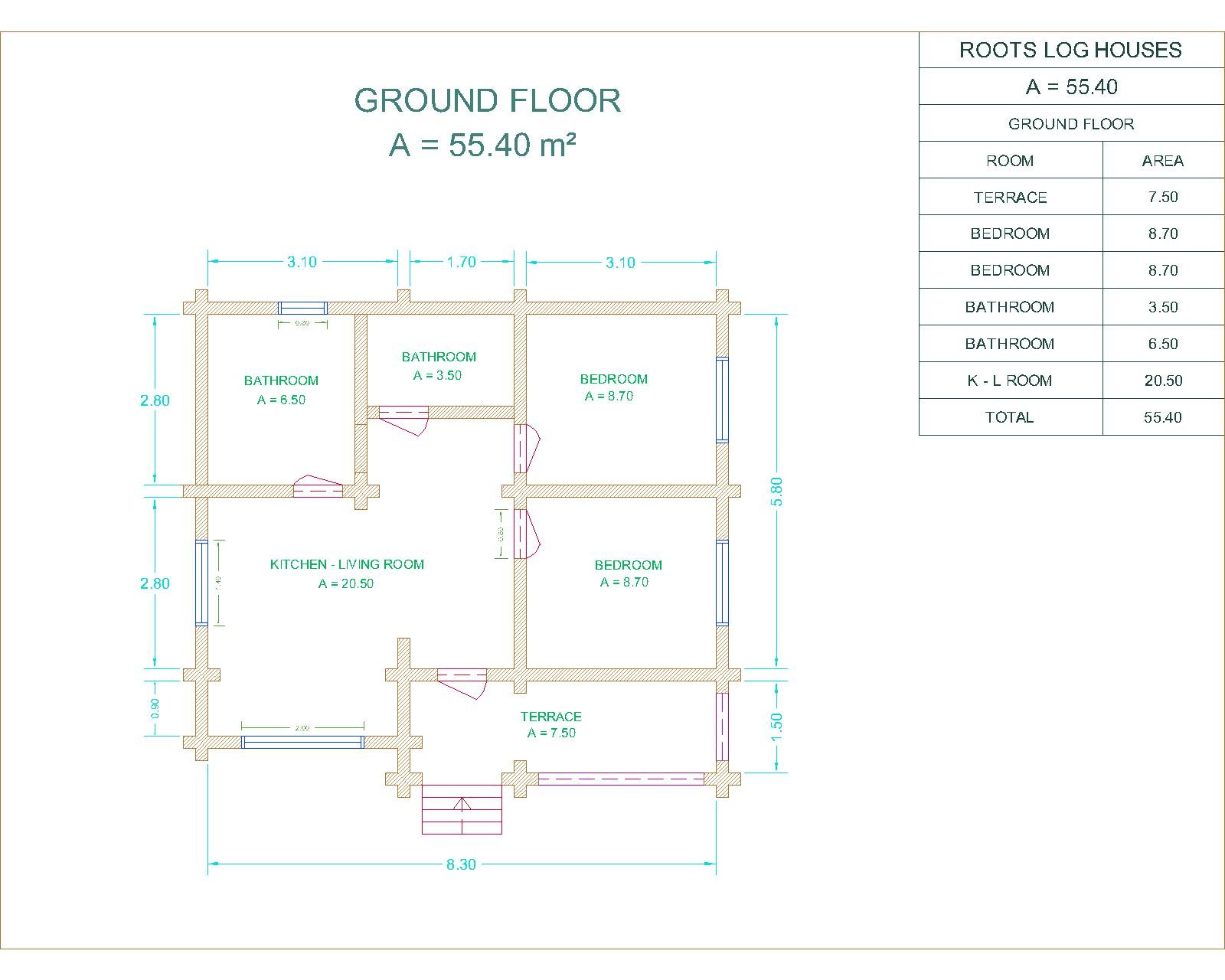 RL6 – 40.80 m2 Classic round log house with kitchen – living room, (2) bedroom, (2) bathroom and large terrace.Floor area = 47.90 M²Terrace area = 7.50 M²Total area = 55.40M² EXPLORE MORE MODELS Round log houses Square log houses Gazebo Get in touch