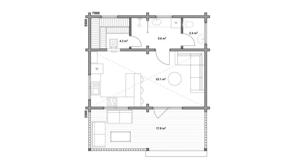 compact modern sauna house that includes  a spacious covered terrace, an open-ceiling kitchen-lounge area, a sauna and a shower room.