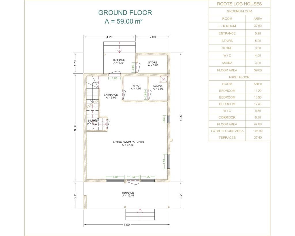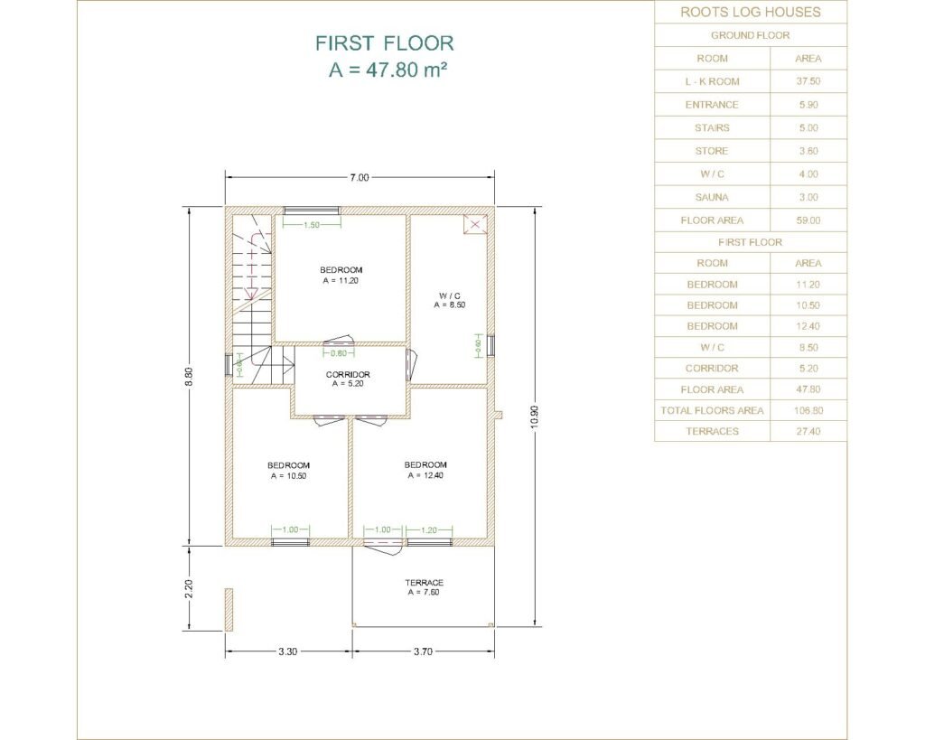 SL13 – 106.80 m2 Modern square log house with kitchen – living room, (3) bedroom, sauna and (2) bathrooms.Number of floors = 2Floor area = 106.80 M²Terraces area = 27.40 M²Total area = 134.20 M² EXPLORE MORE MODELS Round log houses Square log houses Gazebo Get in touch